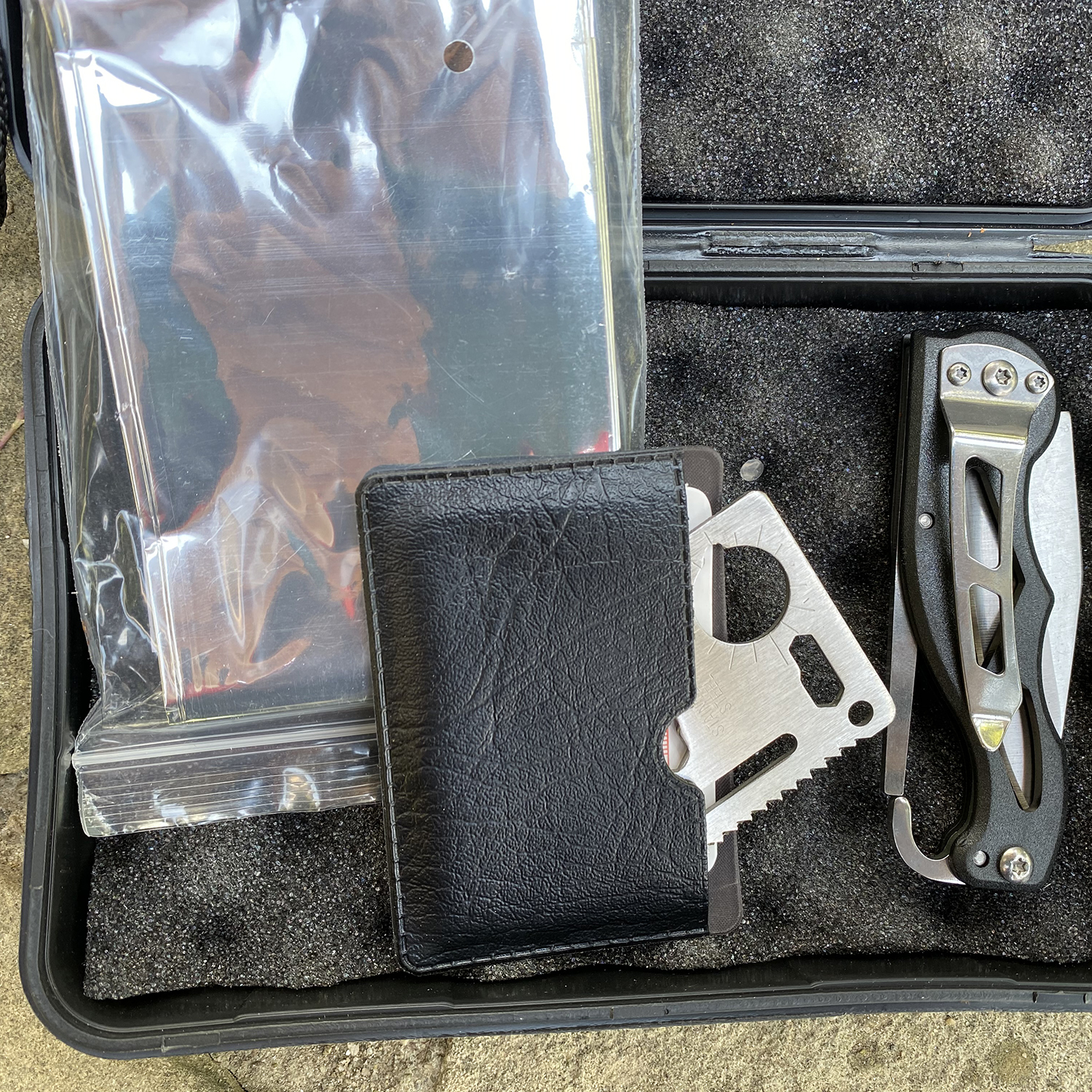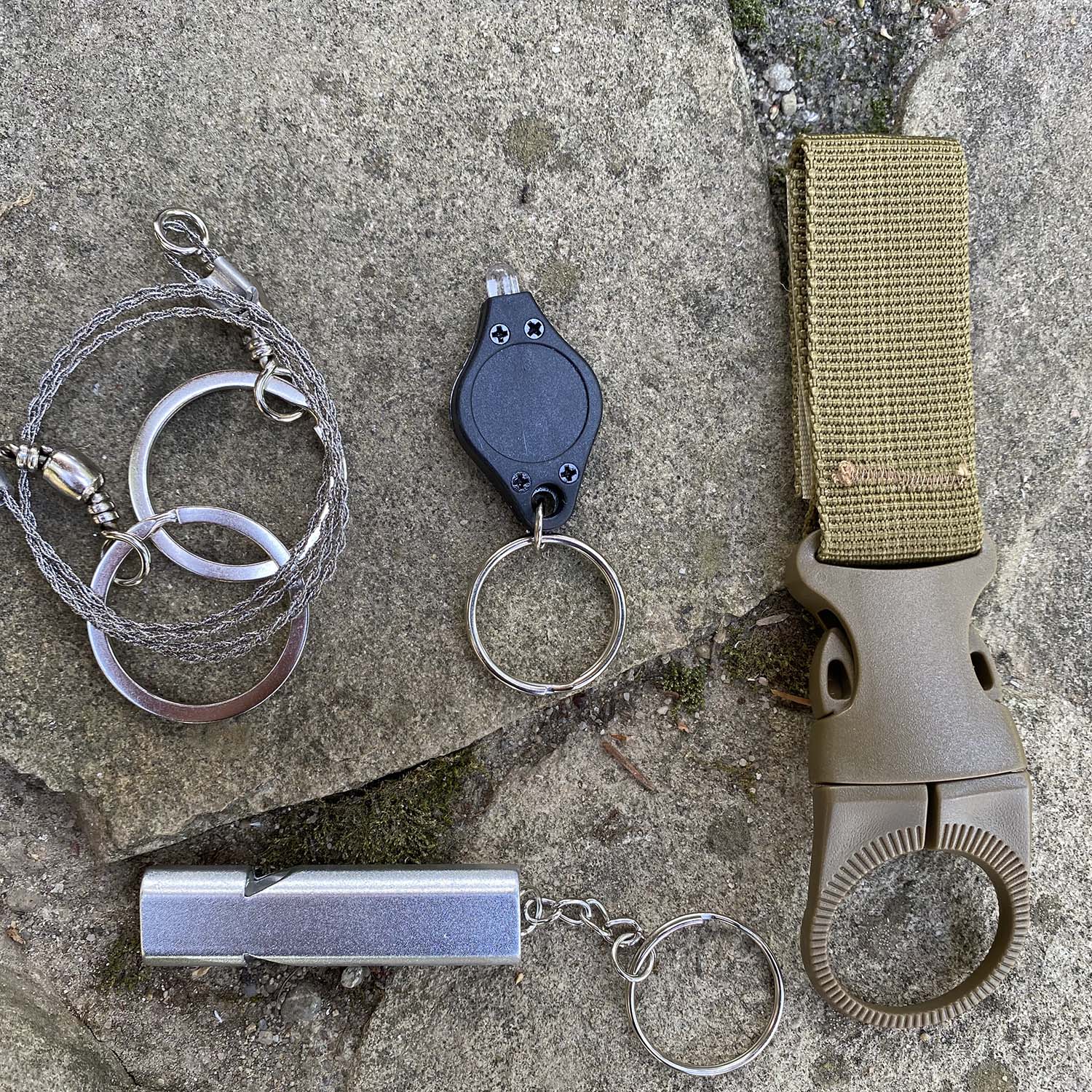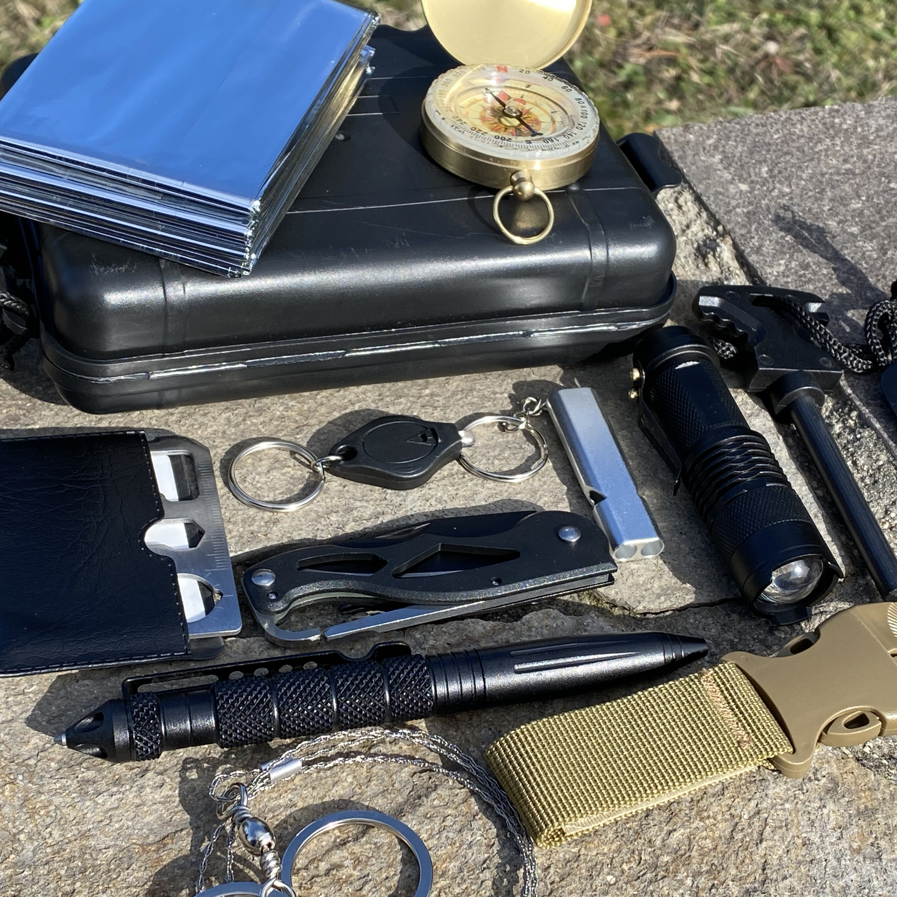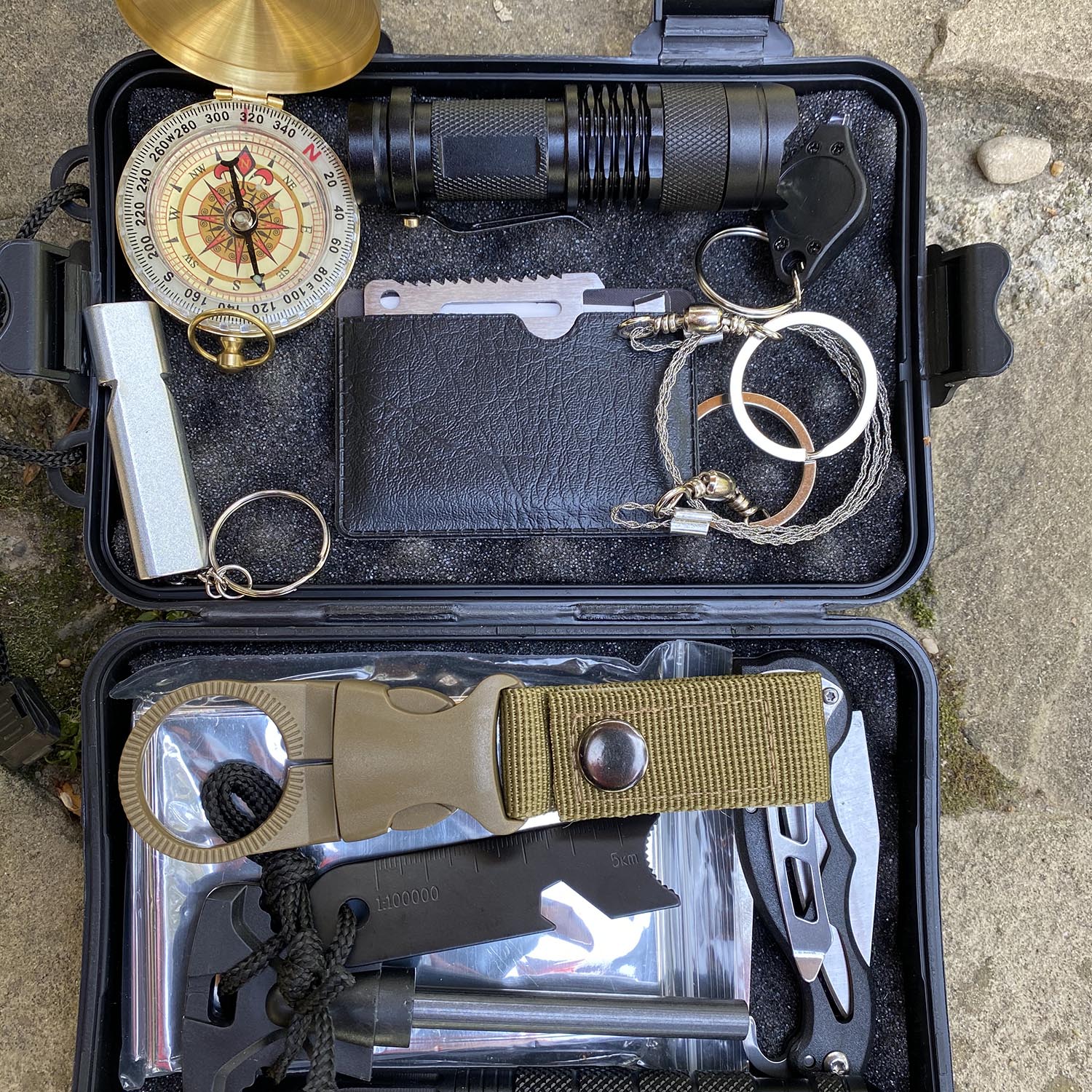ütésálló szállítási doboz ; iránytű; LED-es kulcstartó: 120 decibeles, dupla alumínium jelzősíp; 130x210cm-es hőszigetelő takaró; kovakő; térkép léptékének leolvasásához szükséges technikai vonalzó; extrém körülmények között való íráshoz és ablakbetörésre alkalmas golyóstoll; állítható LED-es elemlámpa ( nem jár hozzá elem ); széles fűrész; karabineres zsebkés; vizesüveg karabiner; multifunkcionális vágásra, szétbontásra, mérésre alkalmas eszköz;