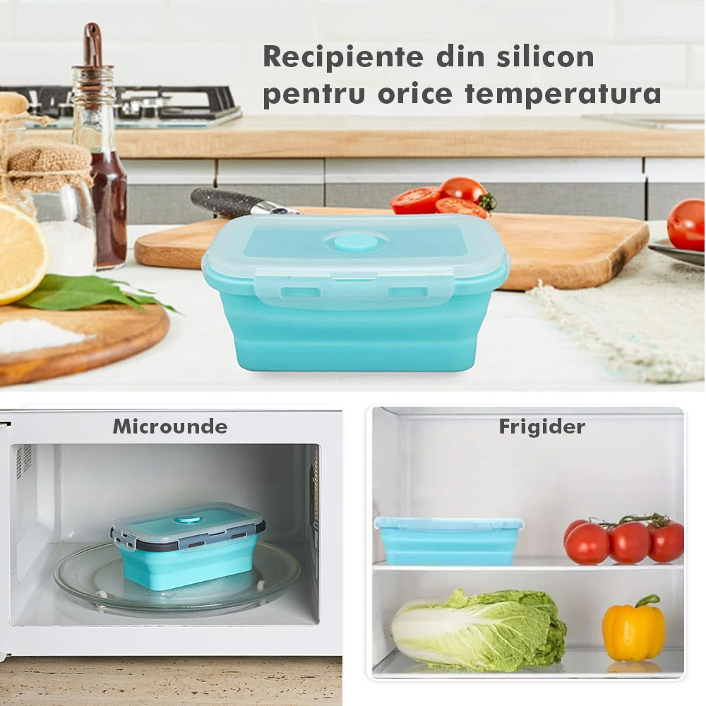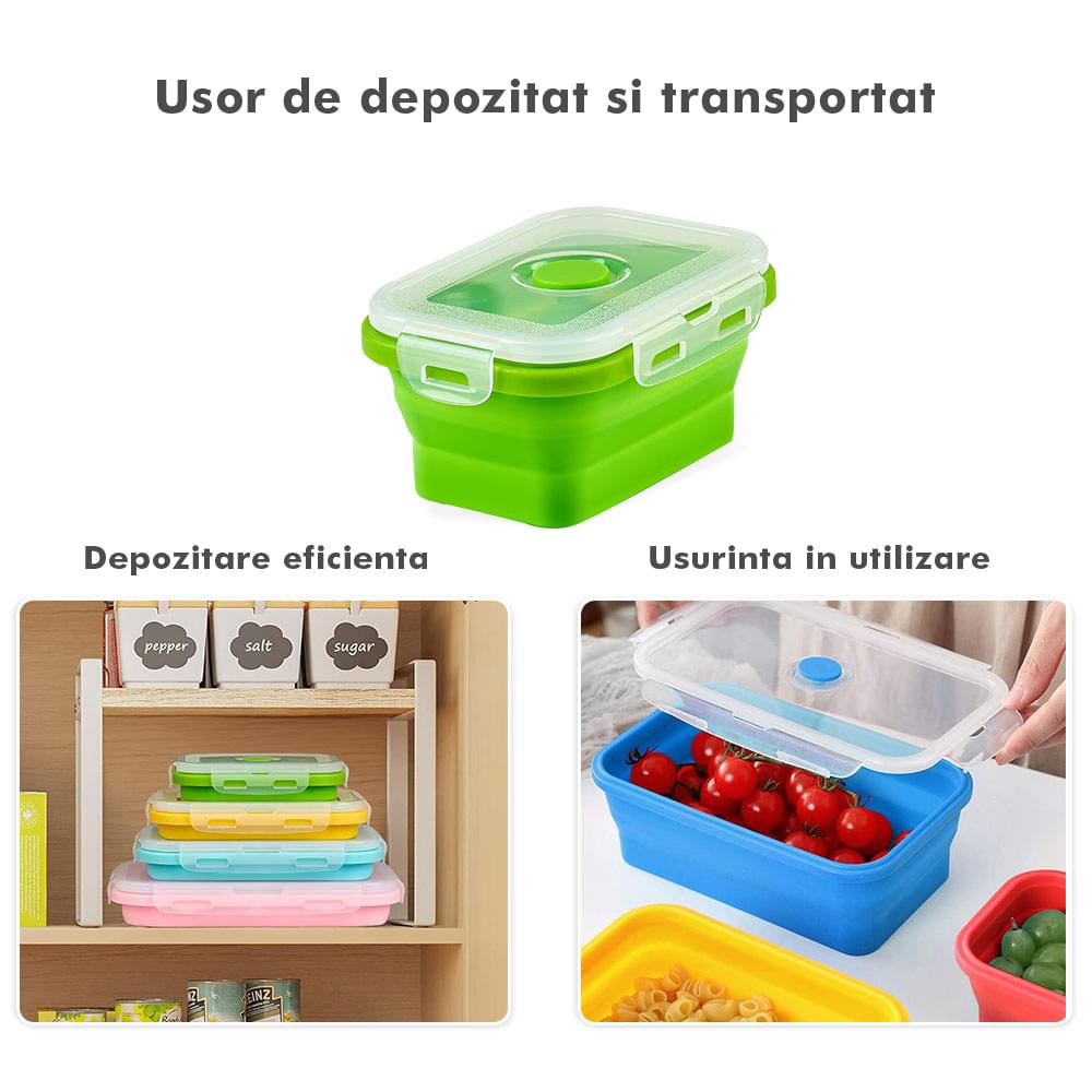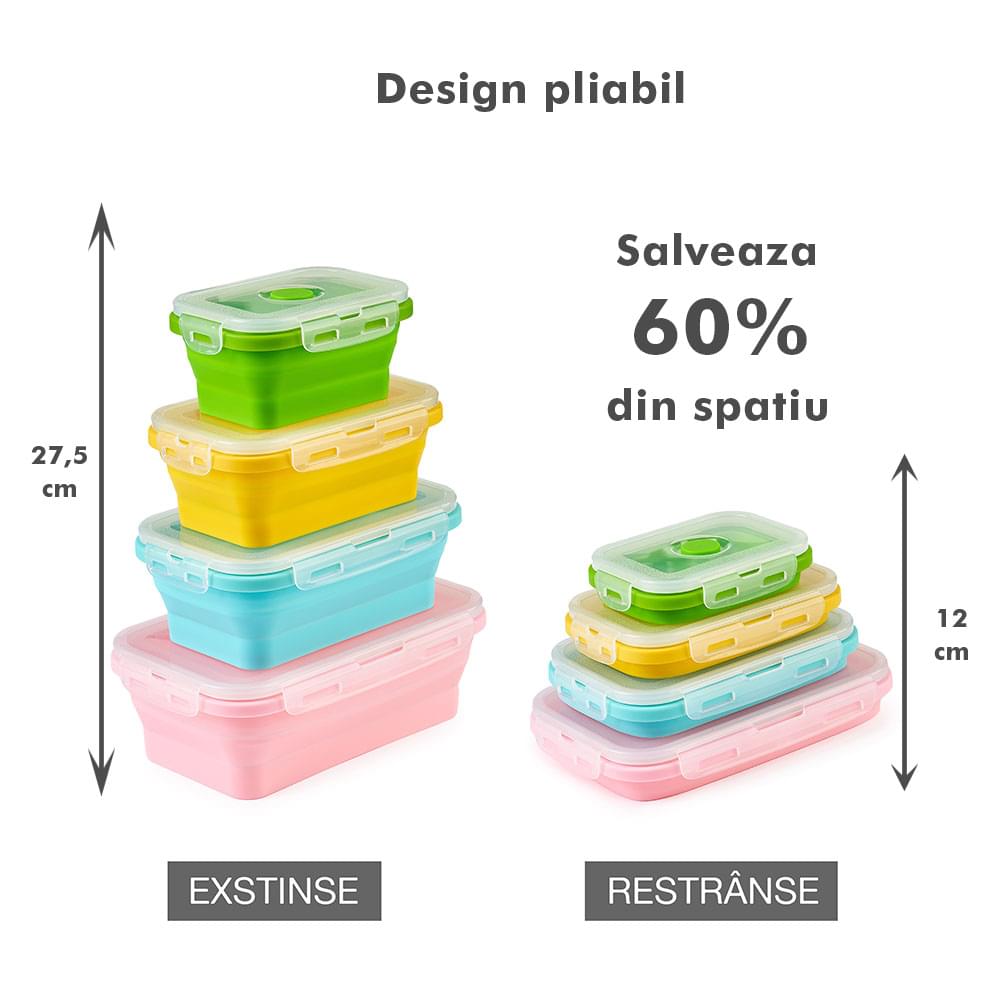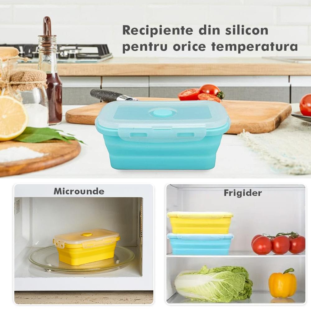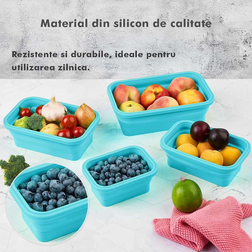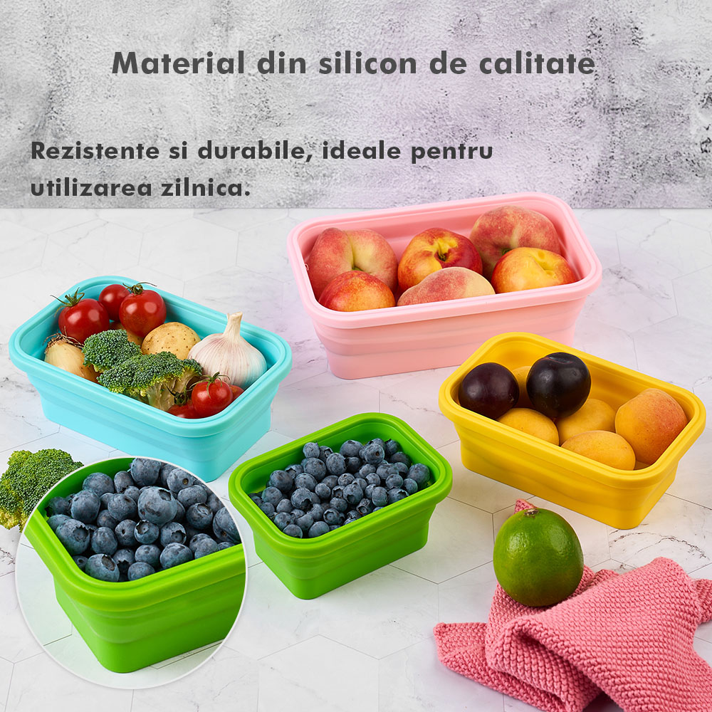 Megmaradt az étel? Csak dobd bele a dobozokba, majd be hűtőbe a kövekező alkalomra. Ilyen módon nem csak helyet spórolsz, hanem időt is melyet a számodra kedves személyekkel tölthetsz. Ajánlott, hogy a tárolóedények -40 és 200 fok közötti hőmérsékleten legyenek tárolva, használhatóak a mikróban vagy az elektromos sütőben. A Bővíthető Tárolóedény Készlet, különböző méretű, divatos, egymásra rakható, újrahasználható és összecsukható edényekből áll: kicsi- 350 ml közepes- 500 ml nagy - 800 ml nagyon nagy - 1200 ml. A tárolók minőségi élelmiszeripari szilikonból készültek, nem tartalmaznak BPA-t, latexet és más kémiai anyagokat és nem változtatják meg az élelmiszerek ízét és szagát. Ez az anyak ökológikus és az egészségre nézve jobb mint a műanyag, mely megrepedhet és rongálódhat. A szilikon tárolóedények könnyen moshatóak és fenntarthatóak. A száraz élelmiszerektől elkezdve, a folyékony élelmiszerekig, az előre feldarabolt és tisztított élelmiszerekig melyek később lesznek felhasználva az ételek elkészítéséhez, ez a készlet sokoldalú és tökéletes a különböző élelmiszerek tárolására. Egyesz tanulmányok alapján, használva ezeket a szilikon tárolóedényeket használva, 60%-ban több helyet spórolsz a konyhádban. onform unor studii, folosind caserole din silicon vei economisi peste 60% din spațiul din bucătăria ta. Ezeknek kapcsos tetejük van és élénken színezettek, így sokkal könnyebben megtalálod őket a szekrényben.