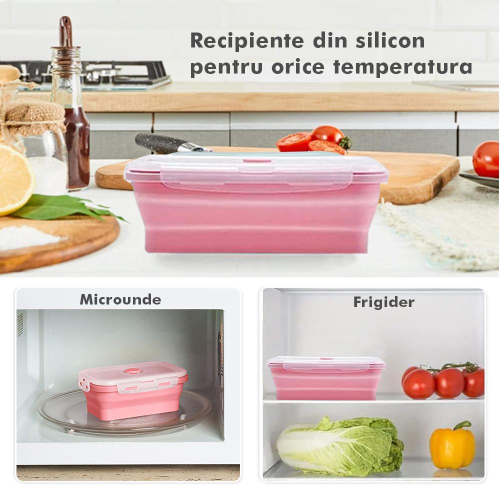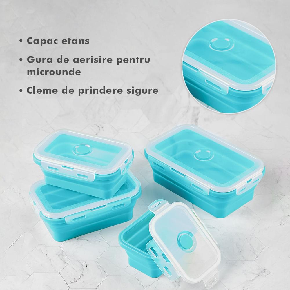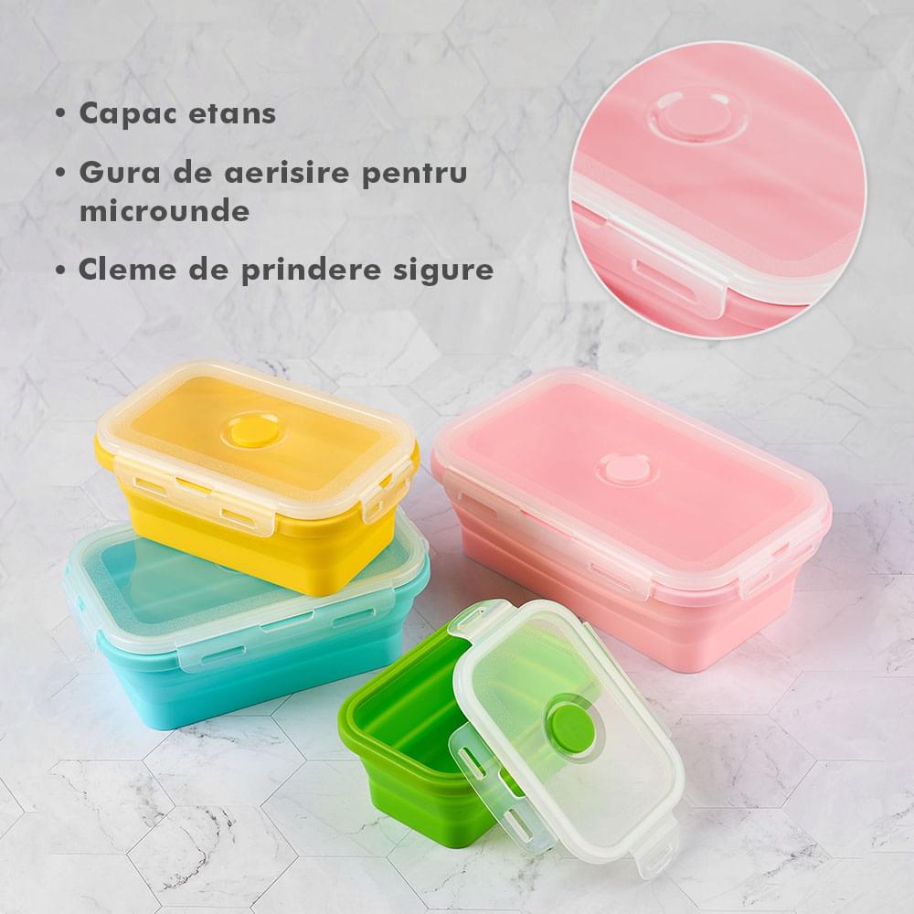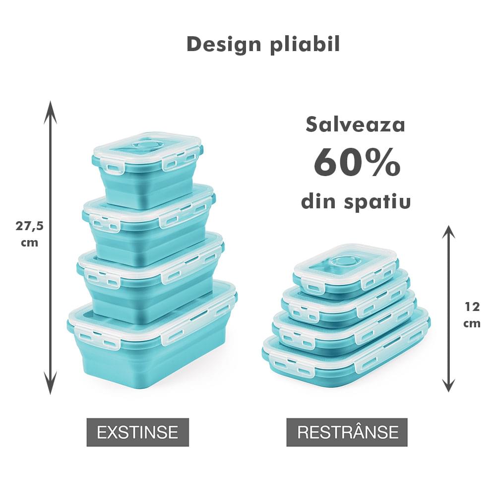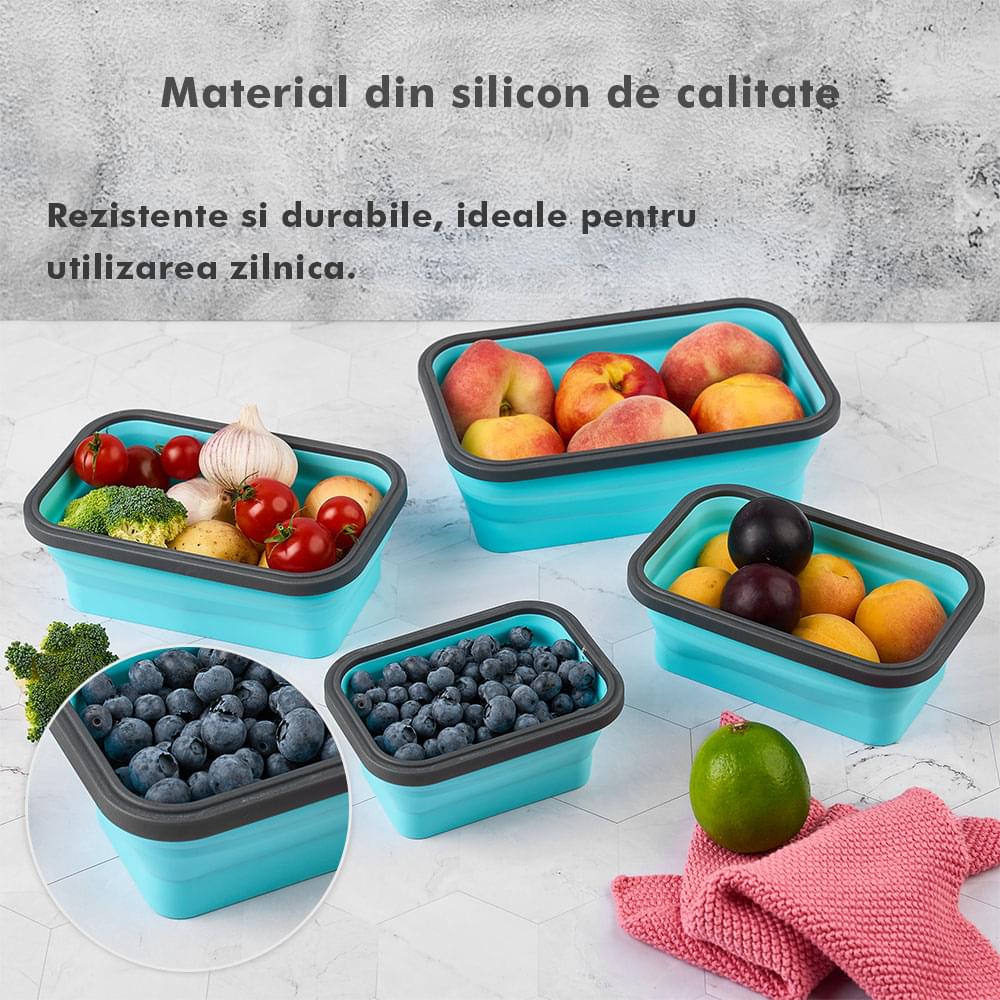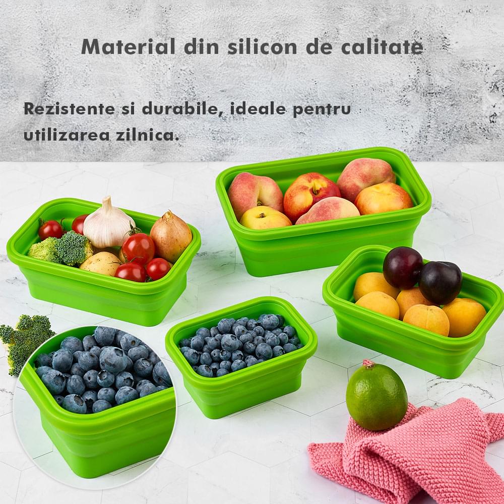 Megmaradt az étel? Csak dobd bele a dobozokba, majd be hűtőbe a kövekező alkalomra. Ilyen módon nem csak helyet spórolsz, hanem időt is melyet a számodra kedves személyekkel tölthetsz. Ajánlott, hogy a tárolóedények -40 és 200 fok közötti hőmérsékleten legyenek tárolva, használhatóak a mikróban vagy az elektromos sütőben. A Bővíthető Tárolóedény Készlet, különböző méretű, divatos, egymásra rakható, újrahasználható és összecsukható edényekből áll: kicsi- 350 ml közepes- 500 ml nagy - 800 ml nagyon nagy - 1200 ml. A tárolók minőségi élelmiszeripari szilikonból készültek, nem tartalmaznak BPA-t, latexet és más kémiai anyagokat és nem változtatják meg az élelmiszerek ízét és szagát. Ez az anyak ökológikus és az egészségre nézve jobb mint a műanyag, mely megrepedhet és rongálódhat. A szilikon tárolóedények könnyen moshatóak és fenntarthatóak. A száraz élelmiszerektől elkezdve, a folyékony élelmiszerekig, az előre feldarabolt és tisztított élelmiszerekig melyek később lesznek felhasználva az ételek elkészítéséhez, ez a készlet sokoldalú és tökéletes a különböző élelmiszerek tárolására. Egyesz tanulmányok alapján, használva ezeket a szilikon tárolóedényeket használva, 60%-ban több helyet spórolsz a konyhádban. onform unor studii, folosind caserole din silicon vei economisi peste 60% din spațiul din bucătăria ta. Ezeknek kapcsos tetejük van és élénken színezettek, így sokkal könnyebben megtalálod őket a szekrényben.