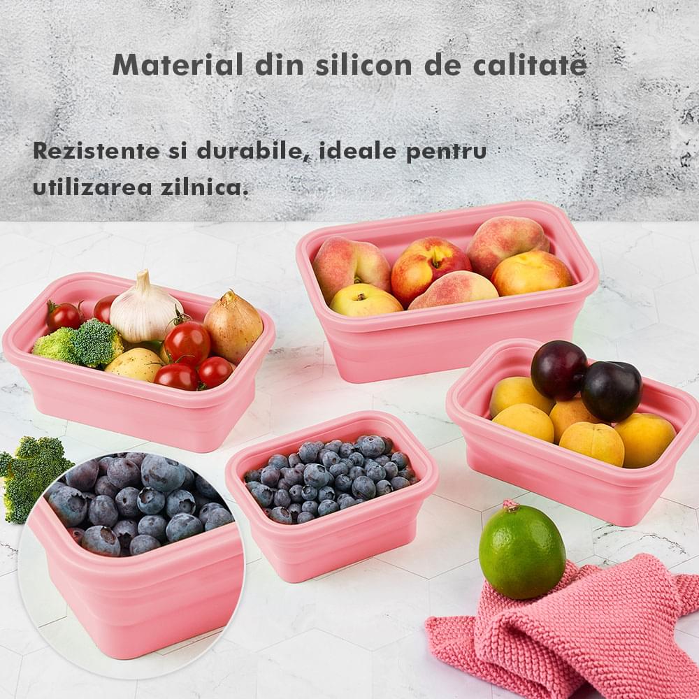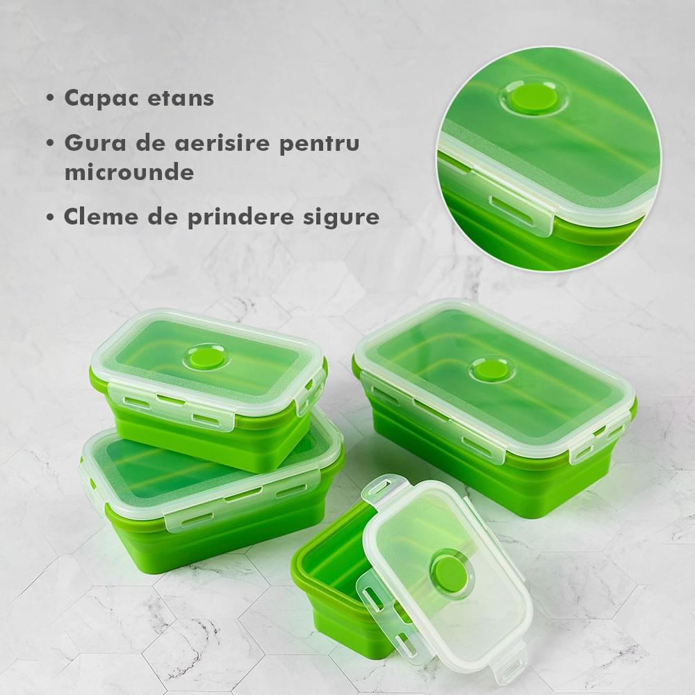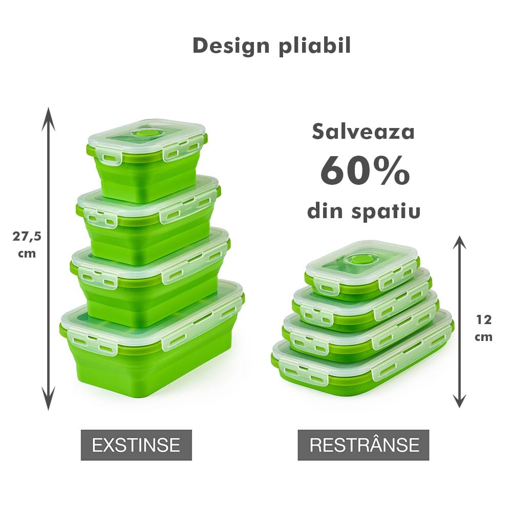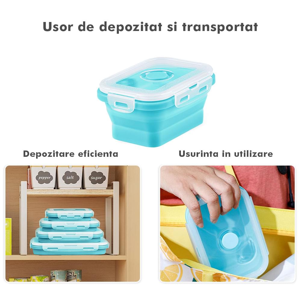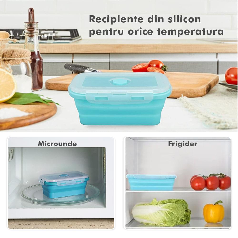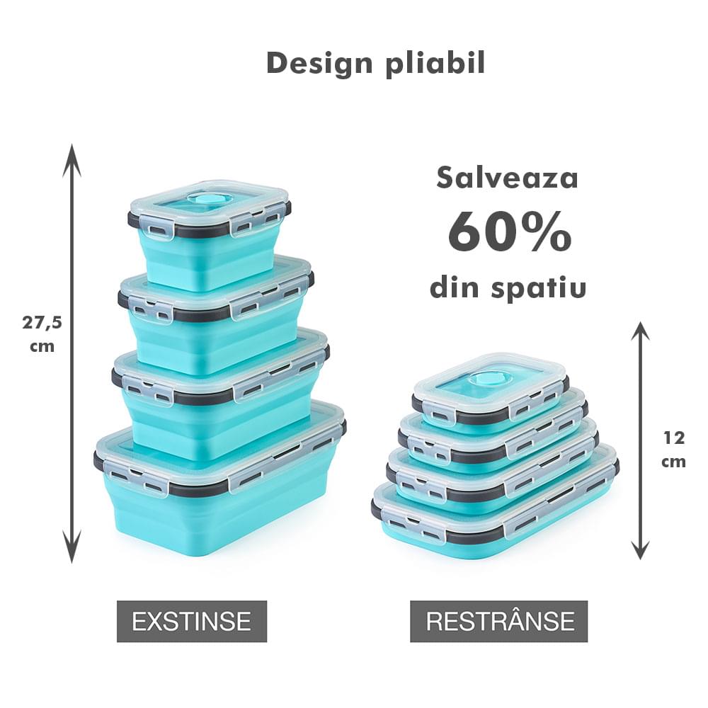 Megmaradt az étel? Csak dobd bele a dobozokba, majd be hűtőbe a kövekező alkalomra. Ilyen módon nem csak helyet spórolsz, hanem időt is melyet a számodra kedves személyekkel tölthetsz. Ajánlott, hogy a tárolóedények -40 és 200 fok közötti hőmérsékleten legyenek tárolva, használhatóak a mikróban vagy az elektromos sütőben. A Bővíthető Tárolóedény Készlet, különböző méretű, divatos, egymásra rakható, újrahasználható és összecsukható edényekből áll: kicsi- 350 ml közepes- 500 ml nagy - 800 ml nagyon nagy - 1200 ml. A tárolók minőségi élelmiszeripari szilikonból készültek, nem tartalmaznak BPA-t, latexet és más kémiai anyagokat és nem változtatják meg az élelmiszerek ízét és szagát. Ez az anyak ökológikus és az egészségre nézve jobb mint a műanyag, mely megrepedhet és rongálódhat. A szilikon tárolóedények könnyen moshatóak és fenntarthatóak. A száraz élelmiszerektől elkezdve, a folyékony élelmiszerekig, az előre feldarabolt és tisztított élelmiszerekig melyek később lesznek felhasználva az ételek elkészítéséhez, ez a készlet sokoldalú és tökéletes a különböző élelmiszerek tárolására. Egyesz tanulmányok alapján, használva ezeket a szilikon tárolóedényeket használva, 60%-ban több helyet spórolsz a konyhádban. onform unor studii, folosind caserole din silicon vei economisi peste 60% din spațiul din bucătăria ta. Ezeknek kapcsos tetejük van és élénken színezettek, így sokkal könnyebben megtalálod őket a szekrényben.