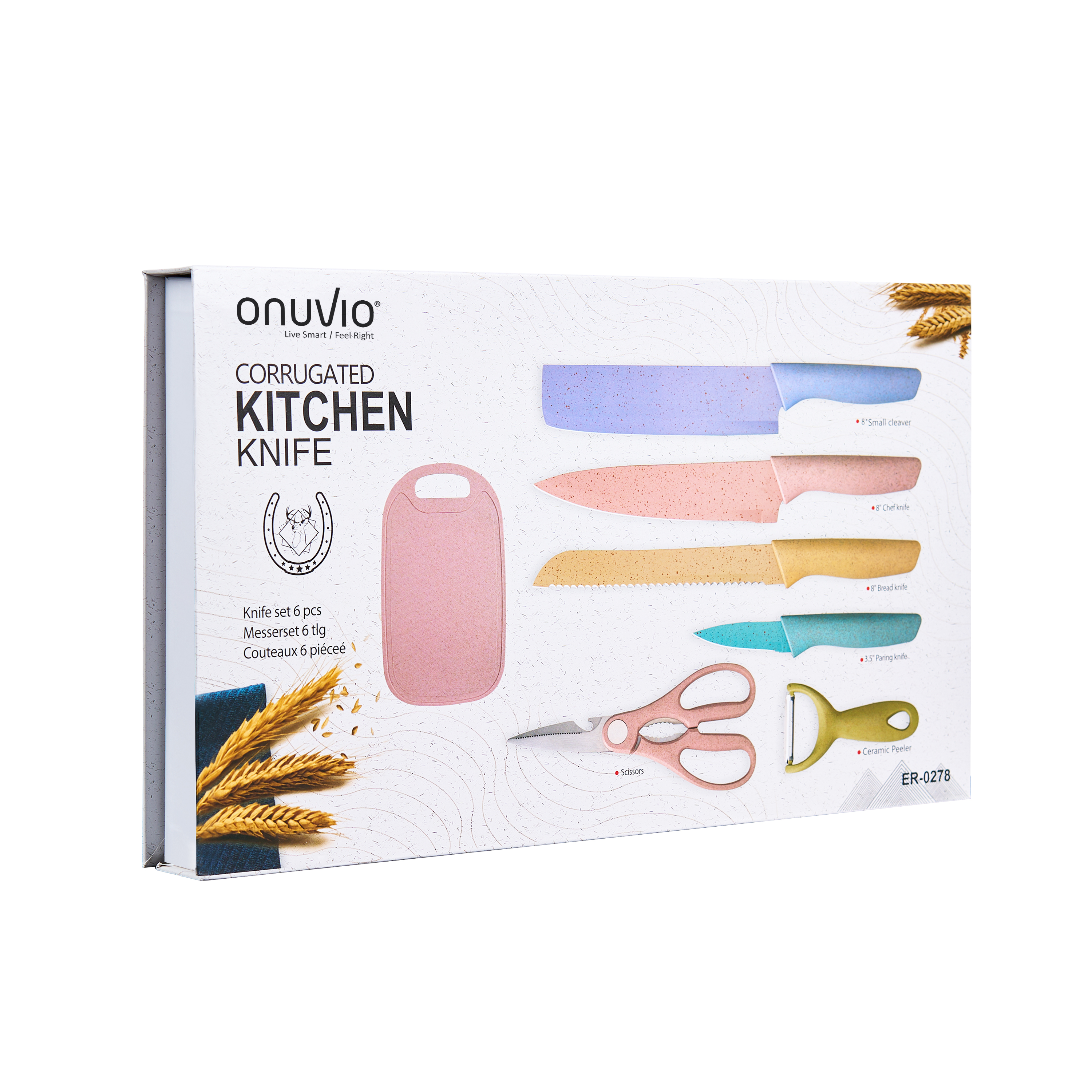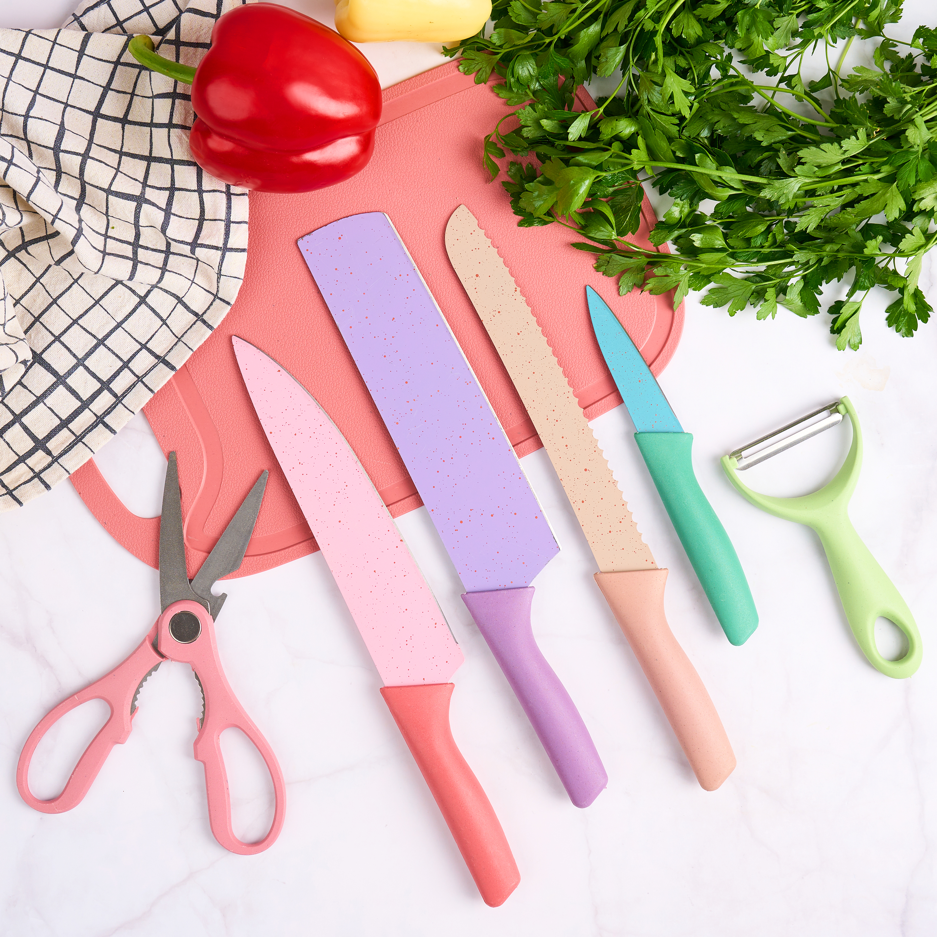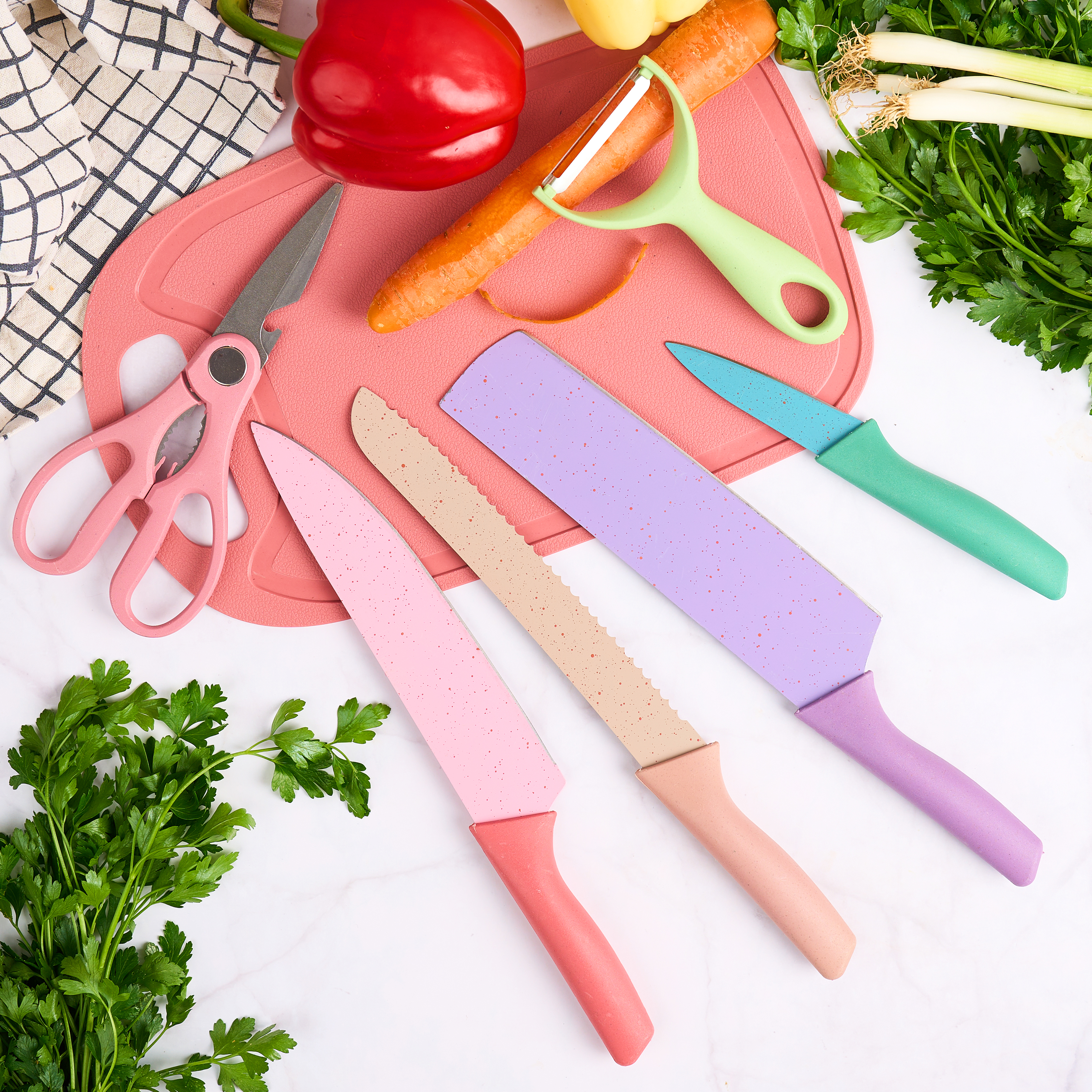 A mi 7 színes késből álló készletünk megfelelő a mindennapi használatra, 3CR13-as rozsdamentes acélból készült és egy márványos védőréteggel rendelkezik. A rozsdamentes acélnak előnye, hogy erősebb pengével rendelkezik, mely ugyanakkor megőrzi a csökkentett vastagságát, ez által ergonómikusabbá téve a késeket.