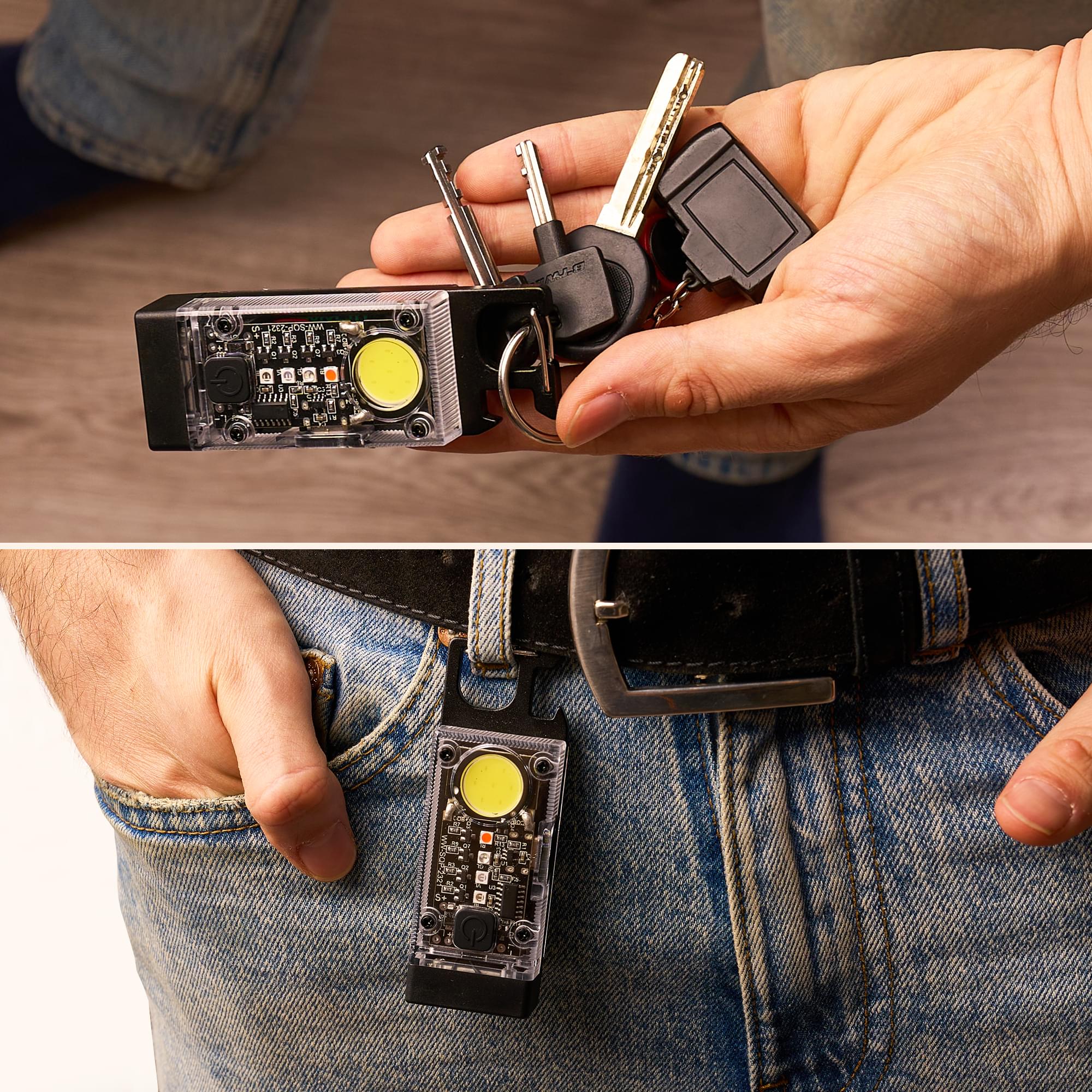 Könnyű és Vízálló: Csak 45 grammot nyom és méretei 45 mm * 60 mm * 22 mm, a mini zseblámpa rendkívül hordozható és könnyen szállítható. Eközben a kulcstartó lámpa IPX5 vízálló, így esős vagy havas napokon is használható anélkül, hogy befolyásolná, ami nagyon kényelmes.